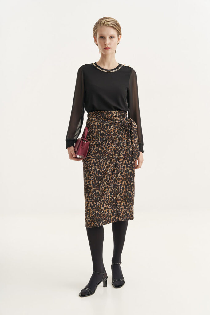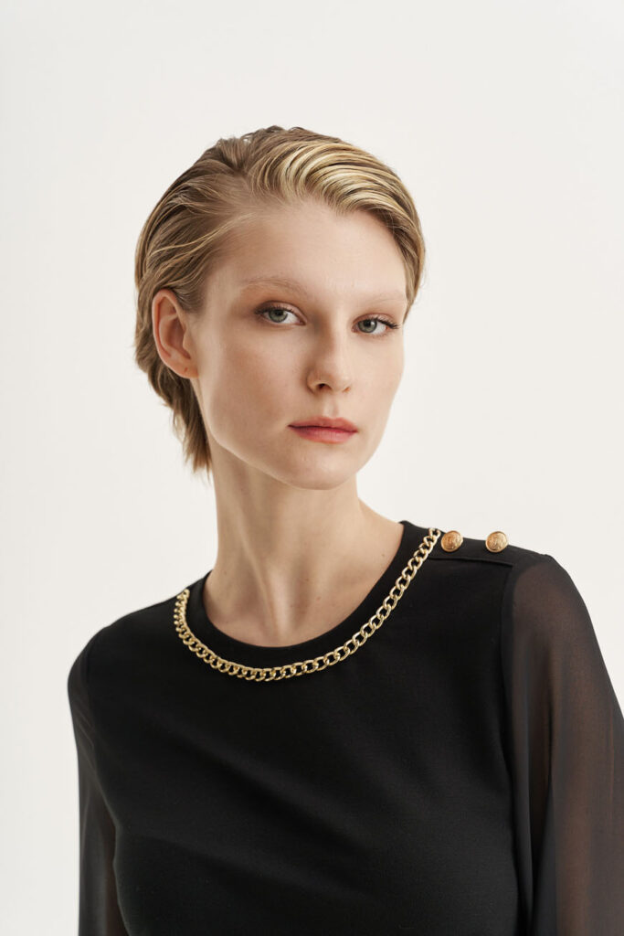 Αυτό το τοπ είναι ό,τι χρειάζεσαι για να πετύχεις το απόλυτο chic! Τα αέρινα μανίκια του και η διακοσμητική αλυσίδα το κάνουν ιδανικό για βραδινές εξόδους. Συνδύασέ το με μια leopard φούστα ή ένα ψιλόμεσο παντελόνι, ανάλογα με τη διάθεση της βραδιάς. Ένα ζευγάρι μαύρα τακούνια ή χρυσά πέδιλα και μερικά διακριτικά κοσμήματα είναι το μόνο που χρειάζεσαι για να ολοκληρώσεις το look.