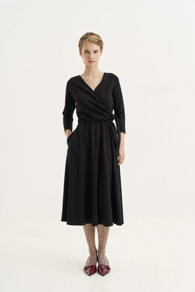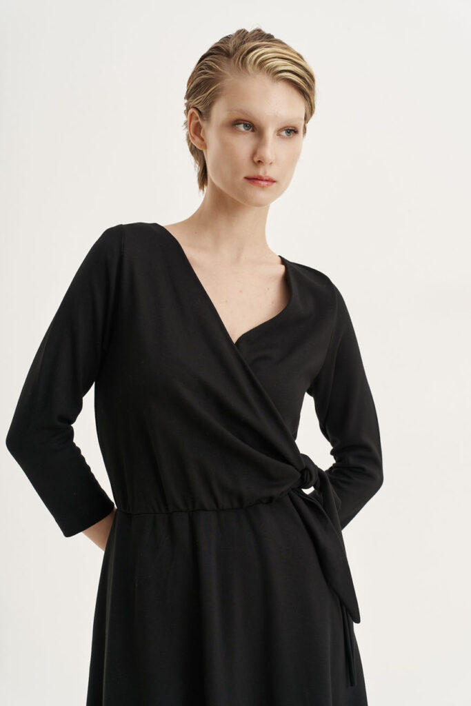 Το μαύρο φόρεμα είναι πάντα η ασφαλής αλλά και δυναμική επιλογή. Αυτό εδώ, με την κλος γραμμή του και τη μαλακή υφή της πλεκτής βισκόζης, αποπνέει μια αβίαστη κομψότητα. Η λαιμόκοψη V κολακεύει απόλυτα και αφήνει χώρο για να προσθέσεις το αγαπημένο σου κολιέ. Συνδύασέ το με λαμπερά σκουλαρίκια, μια ζώνη στη μέση και ένα ζευγάρι γόβες με glitter για έξτρα glam!